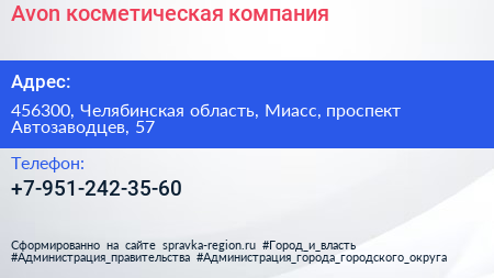 Avon, косметическая компания по адресу 456300, Челябинская область, Миасс, проспект Автозаводцев, 57 в дальнейшем Организация, размещена в следующих категориях: