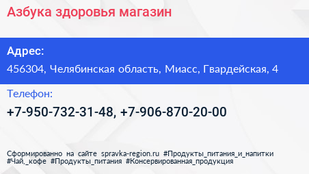 Азбука здоровья, магазин по адресу 456304, Челябинская область, Миасс, Гвардейская, 4 в дальнейшем Организация, размещена в следующих категориях: