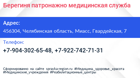 Берегиня, патронажно-медицинская служба по адресу 456304, Челябинская область, Миасс, Гвардейская, 7 в дальнейшем Организация, размещена в следующих категориях: