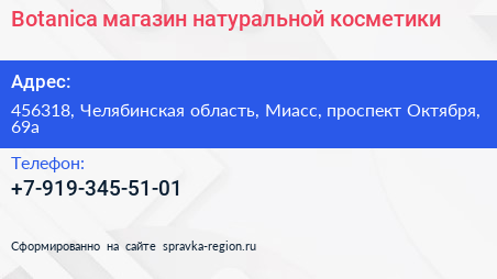 Botanica, магазин натуральной косметики по адресу 456318, Челябинская область, Миасс, проспект Октября, 69а в дальнейшем Организация, размещена в следующих категориях:
