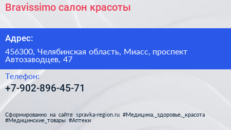 Bravissimo, салон красоты по адресу 456300, Челябинская область, Миасс, проспект Автозаводцев, 47 в дальнейшем Организация, размещена в следующих категориях: