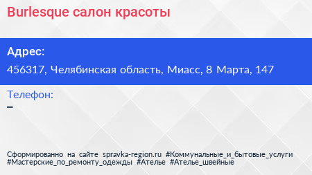 Burlesque, салон красоты по адресу 456317, Челябинская область, Миасс, 8 Марта, 147 в дальнейшем Организация, размещена в следующих категориях: