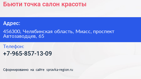 Бьюти точка, салон красоты по адресу 456300, Челябинская область, Миасс, проспект Автозаводцев, 65 в дальнейшем Организация, размещена в следующих категориях: