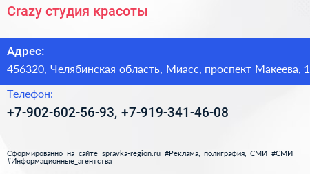 Crazy, студия красоты по адресу 456320, Челябинская область, Миасс, проспект Макеева, 1 в дальнейшем Организация, размещена в следующих категориях: