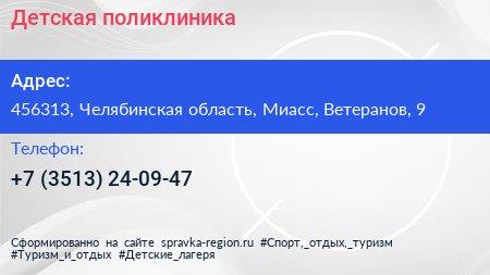 Детская поликлиника по адресу 456313, Челябинская область, Миасс, Ветеранов, 9 в дальнейшем Организация, размещена в следующих категориях: