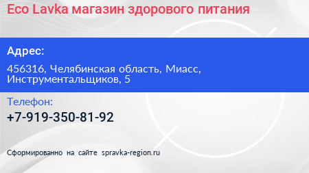 Eco Lavka, магазин здорового питания по адресу 456316, Челябинская область, Миасс, Инструментальщиков, 5 в дальнейшем Организация, размещена в следующих категориях: