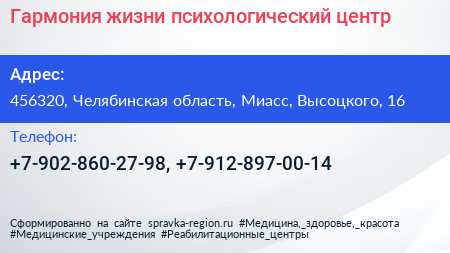 Гармония жизни, психологический центр по адресу 456320, Челябинская область, Миасс, Высоцкого, 16 в дальнейшем Организация, размещена в следующих категориях: