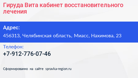 Гируда Вита, кабинет восстановительного лечения по адресу 456313, Челябинская область, Миасс, Нахимова, 23 в дальнейшем Организация, размещена в следующих категориях: