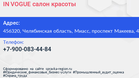 IN VOGUE, салон красоты по адресу 456320, Челябинская область, Миасс, проспект Макеева, 4 в дальнейшем Организация, размещена в следующих категориях: