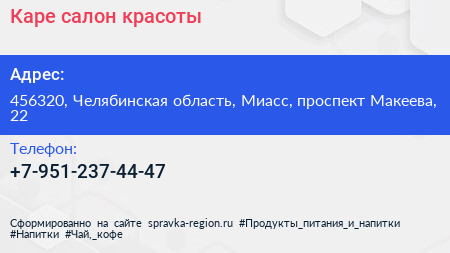 Каре, салон красоты по адресу 456320, Челябинская область, Миасс, проспект Макеева, 22 в дальнейшем Организация, размещена в следующих категориях: