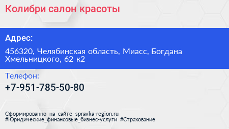 Колибри, салон красоты по адресу 456320, Челябинская область, Миасс, Богдана Хмельницкого, 62 к2 в дальнейшем Организация, размещена в следующих категориях: