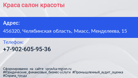 Краса, салон красоты по адресу 456320, Челябинская область, Миасс, Менделеева, 15 в дальнейшем Организация, размещена в следующих категориях: