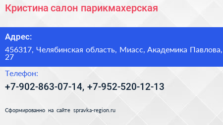 Кристина, салон-парикмахерская по адресу 456317, Челябинская область, Миасс, Академика Павлова, 27 в дальнейшем Организация, размещена в следующих категориях: