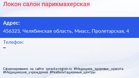 Локон, салон-парикмахерская по адресу 456323, Челябинская область, Миасс, Пролетарская, 4 в дальнейшем Организация, размещена в следующих категориях: