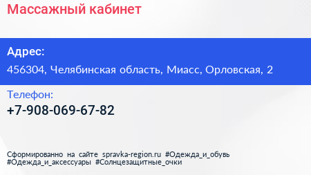 Массажный кабинет по адресу 456304, Челябинская область, Миасс, Орловская, 2 в дальнейшем Организация, размещена в следующих категориях: