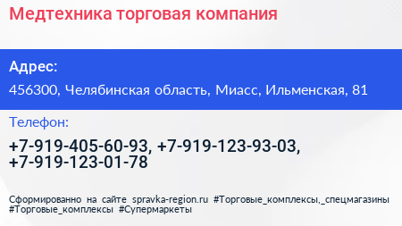 Медтехника, торговая компания по адресу 456300, Челябинская область, Миасс, Ильменская, 81 в дальнейшем Организация, размещена в следующих категориях:
