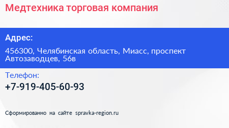 Медтехника, торговая компания по адресу 456300, Челябинская область, Миасс, проспект Автозаводцев, 56в в дальнейшем Организация, размещена в следующих категориях: