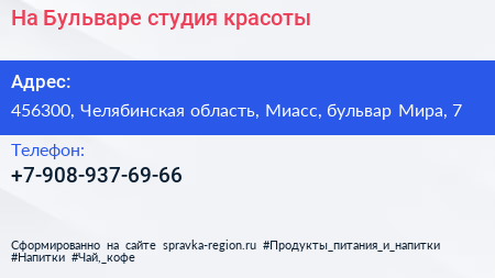 На Бульваре, студия красоты по адресу 456300, Челябинская область, Миасс, бульвар Мира, 7 в дальнейшем Организация, размещена в следующих категориях: