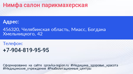 Нимфа, салон-парикмахерская по адресу 456320, Челябинская область, Миасс, Богдана Хмельницкого, 42 в дальнейшем Организация, размещена в следующих категориях: