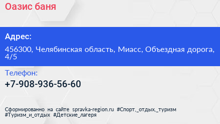 Оазис, баня по адресу 456300, Челябинская область, Миасс, Объездная дорога, 4/5 в дальнейшем Организация, размещена в следующих категориях: