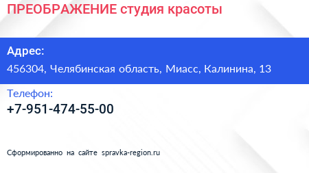 ПРЕОБРАЖЕНИЕ, студия красоты по адресу 456304, Челябинская область, Миасс, Калинина, 13 в дальнейшем Организация, размещена в следующих категориях: