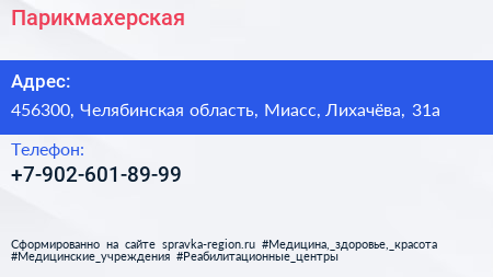 Парикмахерская по адресу 456300, Челябинская область, Миасс, Лихачёва, 31а в дальнейшем Организация, размещена в следующих категориях: