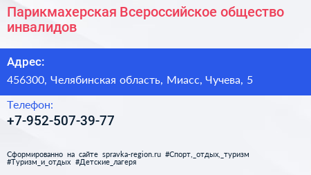 Парикмахерская, Всероссийское общество инвалидов по адресу 456300, Челябинская область, Миасс, Чучева, 5 в дальнейшем Организация, размещена в следующих категориях: