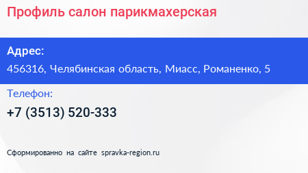 Профиль, салон-парикмахерская по адресу 456316, Челябинская область, Миасс, Романенко, 5 в дальнейшем Организация, размещена в следующих категориях: