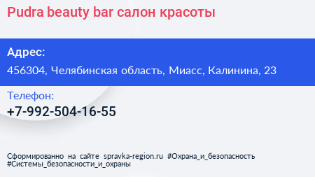 Pudra beauty bar, салон красоты по адресу 456304, Челябинская область, Миасс, Калинина, 23 в дальнейшем Организация, размещена в следующих категориях: