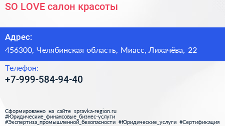 SO LOVE, салон красоты по адресу 456300, Челябинская область, Миасс, Лихачёва, 22 в дальнейшем Организация, размещена в следующих категориях: