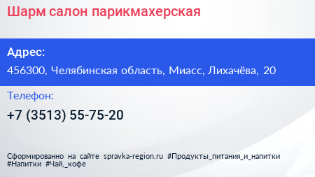 Шарм, салон-парикмахерская по адресу 456300, Челябинская область, Миасс, Лихачёва, 20 в дальнейшем Организация, размещена в следующих категориях: