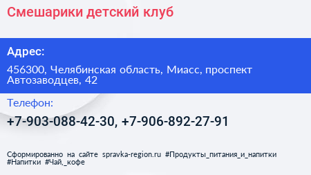 Смешарики, детский клуб по адресу 456300, Челябинская область, Миасс, проспект Автозаводцев, 42 в дальнейшем Организация, размещена в следующих категориях: