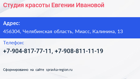 Студия красоты Евгении Ивановой по адресу 456304, Челябинская область, Миасс, Калинина, 13 в дальнейшем Организация, размещена в следующих категориях: