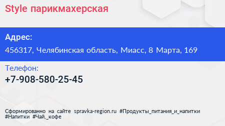 Style, парикмахерская по адресу 456317, Челябинская область, Миасс, 8 Марта, 169 в дальнейшем Организация, размещена в следующих категориях: