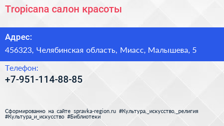 Tropicana, салон красоты по адресу 456323, Челябинская область, Миасс, Малышева, 5 в дальнейшем Организация, размещена в следующих категориях: