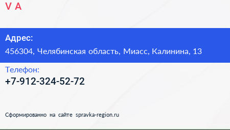 V & A по адресу 456304, Челябинская область, Миасс, Калинина, 13 в дальнейшем Организация, размещена в следующих категориях: