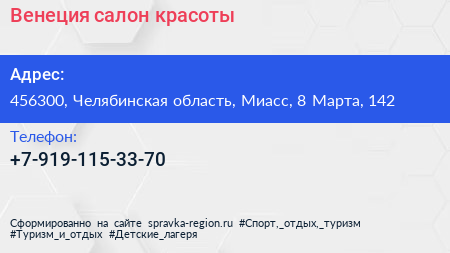 Венеция, салон красоты по адресу 456300, Челябинская область, Миасс, 8 Марта, 142 в дальнейшем Организация, размещена в следующих категориях:
