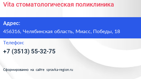 Vita, стоматологическая поликлиника по адресу 456316, Челябинская область, Миасс, Победы, 18 в дальнейшем Организация, размещена в следующих категориях: