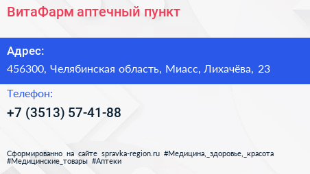 ВитаФарм, аптечный пункт по адресу 456300, Челябинская область, Миасс, Лихачёва, 23 в дальнейшем Организация, размещена в следующих категориях: