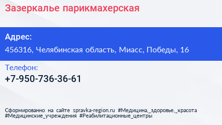 Зазеркалье, парикмахерская по адресу 456316, Челябинская область, Миасс, Победы, 16 в дальнейшем Организация, размещена в следующих категориях: