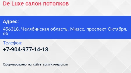 De-Luxe, салон потолков по адресу 456318, Челябинская область, Миасс, проспект Октября, 66 в дальнейшем Организация, размещена в следующих категориях: