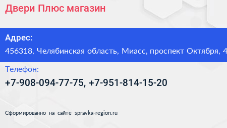 Двери Плюс, магазин по адресу 456318, Челябинская область, Миасс, проспект Октября, 4 в дальнейшем Организация, размещена в следующих категориях: