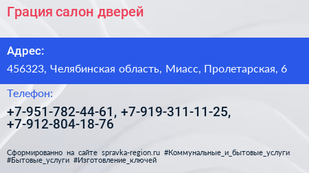 Грация, салон дверей по адресу 456323, Челябинская область, Миасс, Пролетарская, 6 в дальнейшем Организация, размещена в следующих категориях: