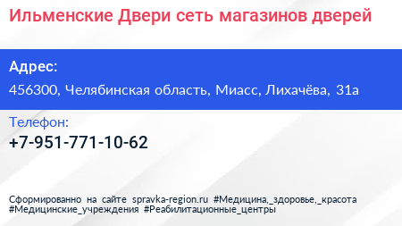 Ильменские Двери, сеть магазинов дверей по адресу 456300, Челябинская область, Миасс, Лихачёва, 31а в дальнейшем Организация, размещена в следующих категориях: