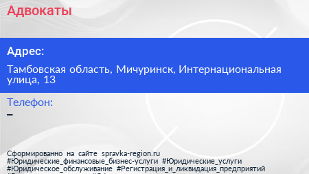 Адвокаты по адресу Тамбовская область, Мичуринск, Интернациональная улица, 13 в дальнейшем Организация, размещена в следующих категориях: