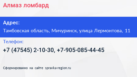 Алмаз, ломбард по адресу Тамбовская область, Мичуринск, улица Лермонтова, 11 в дальнейшем Организация, размещена в следующих категориях: