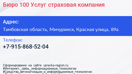 Бюро 100 Услуг, страховая компания по адресу Тамбовская область, Мичуринск, Красная улица, 89а в дальнейшем Организация, размещена в следующих категориях: