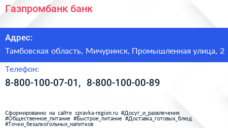 Газпромбанк, банк по адресу Тамбовская область, Мичуринск, Промышленная улица, 2 в дальнейшем Организация, размещена в следующих категориях: