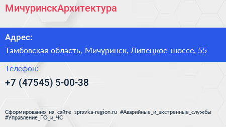 МичуринскАрхитектура по адресу Тамбовская область, Мичуринск, Липецкое шоссе, 55 в дальнейшем Организация, размещена в следующих категориях: