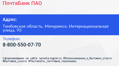 ПочтаБанк, ПАО по адресу Тамбовская область, Мичуринск, Интернациональная улица, 93 в дальнейшем Организация, размещена в следующих категориях: